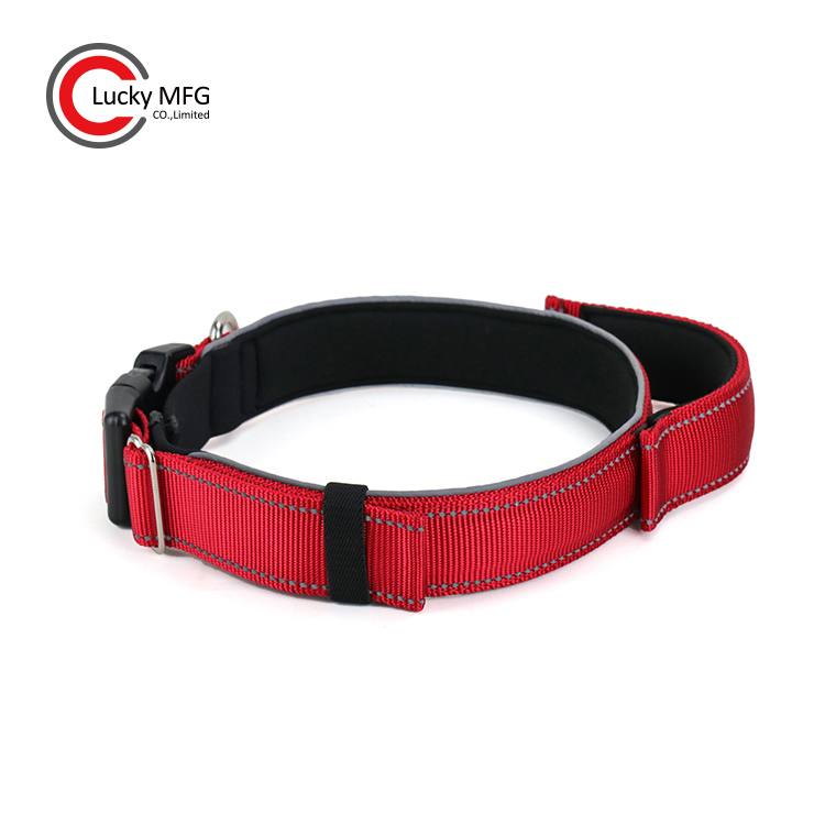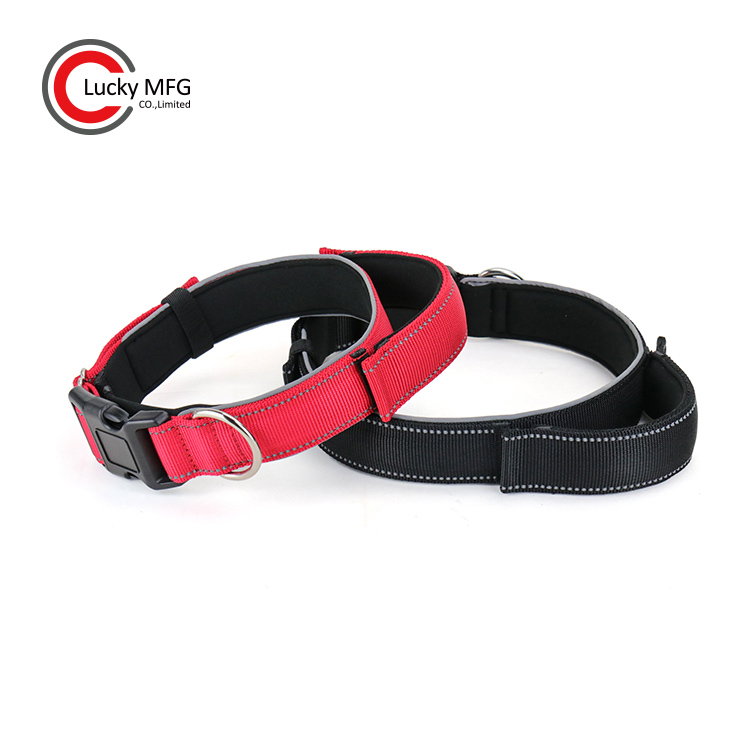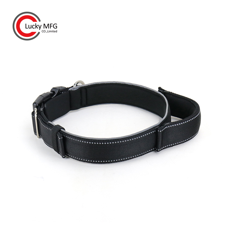 Dog collar with soft neoprene padded, stitching reflective fabric at the collar circumference.